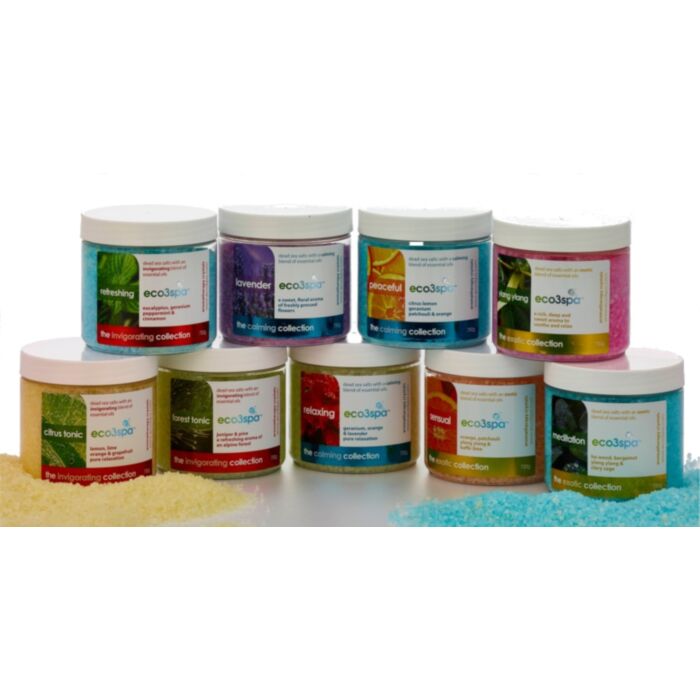 eco3spa completely natural hot tub aromatherapy salts are made from Dead Sea salts and a minimum of 1% pure essential oils. The large crystals are slow dissolving to give a long lasting effect in the tub.